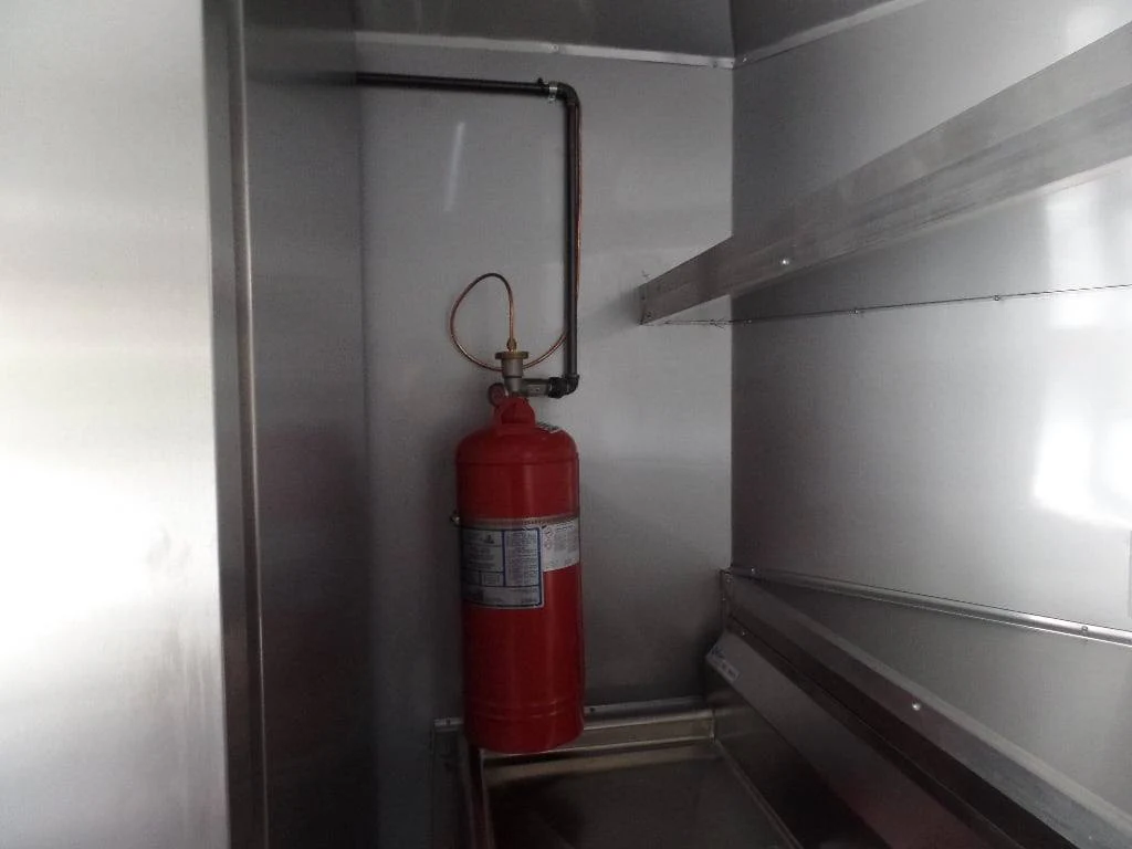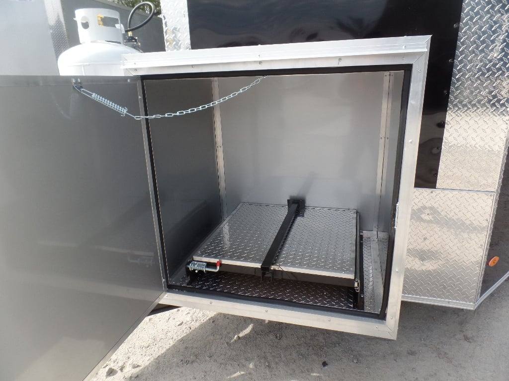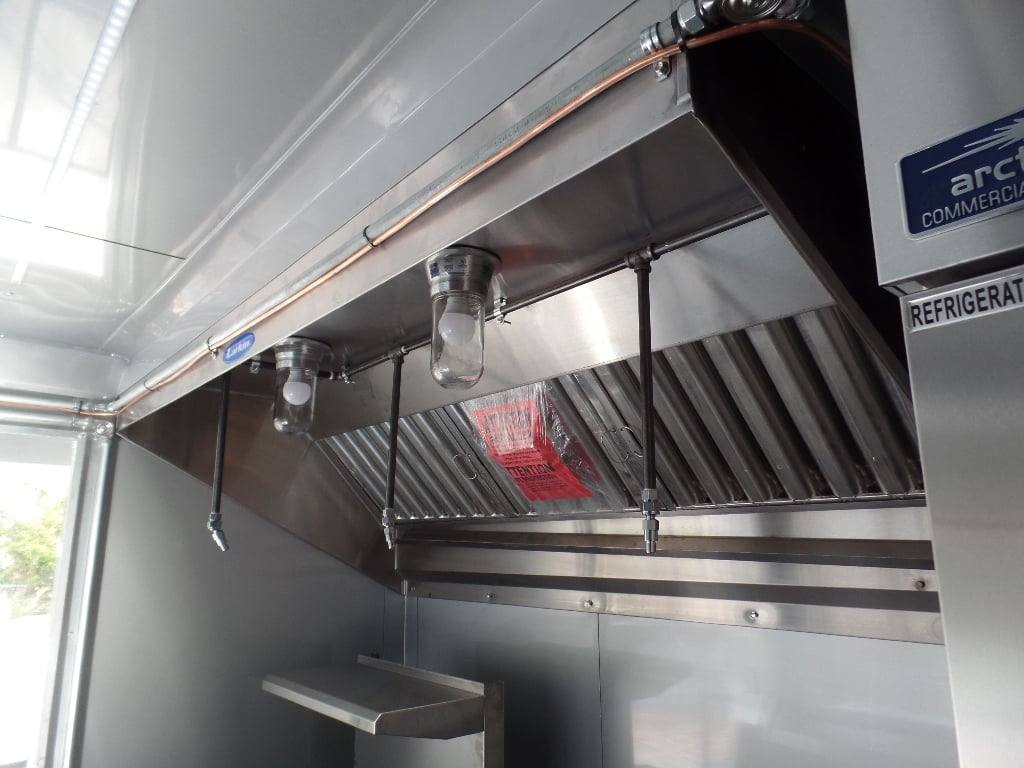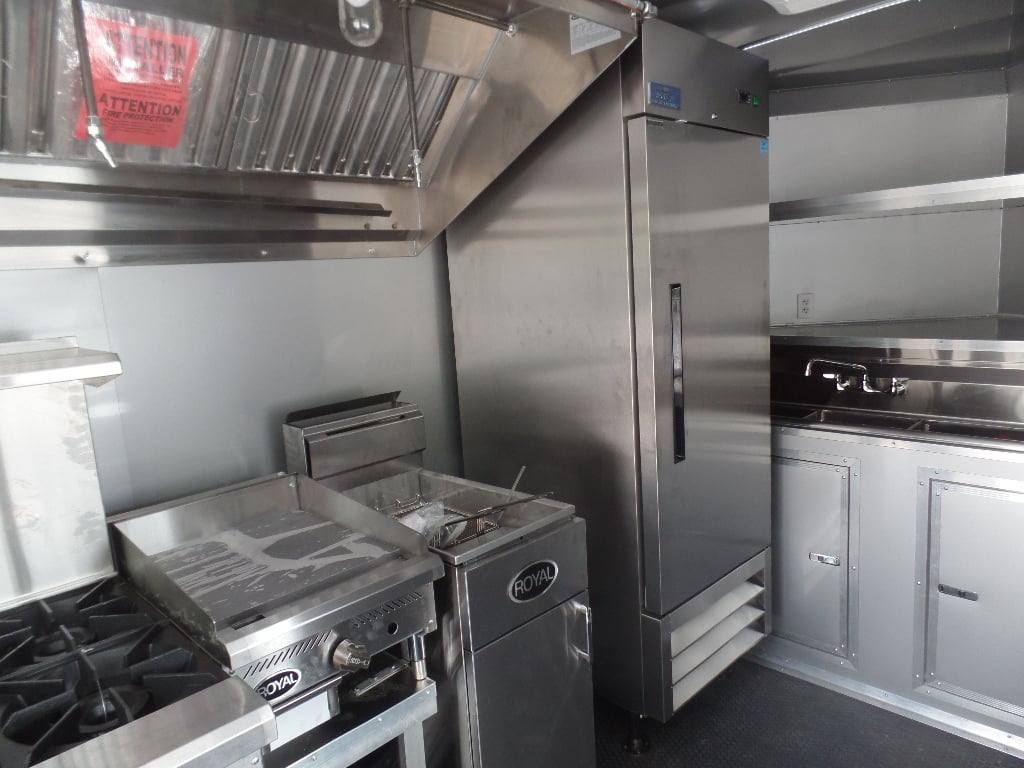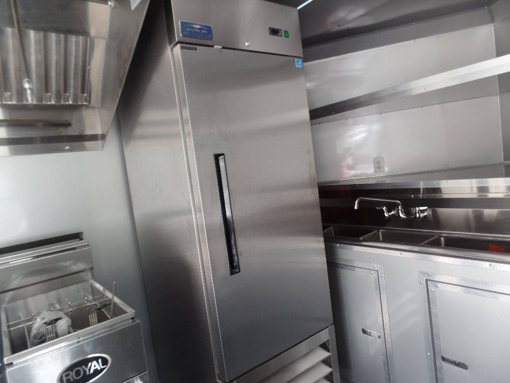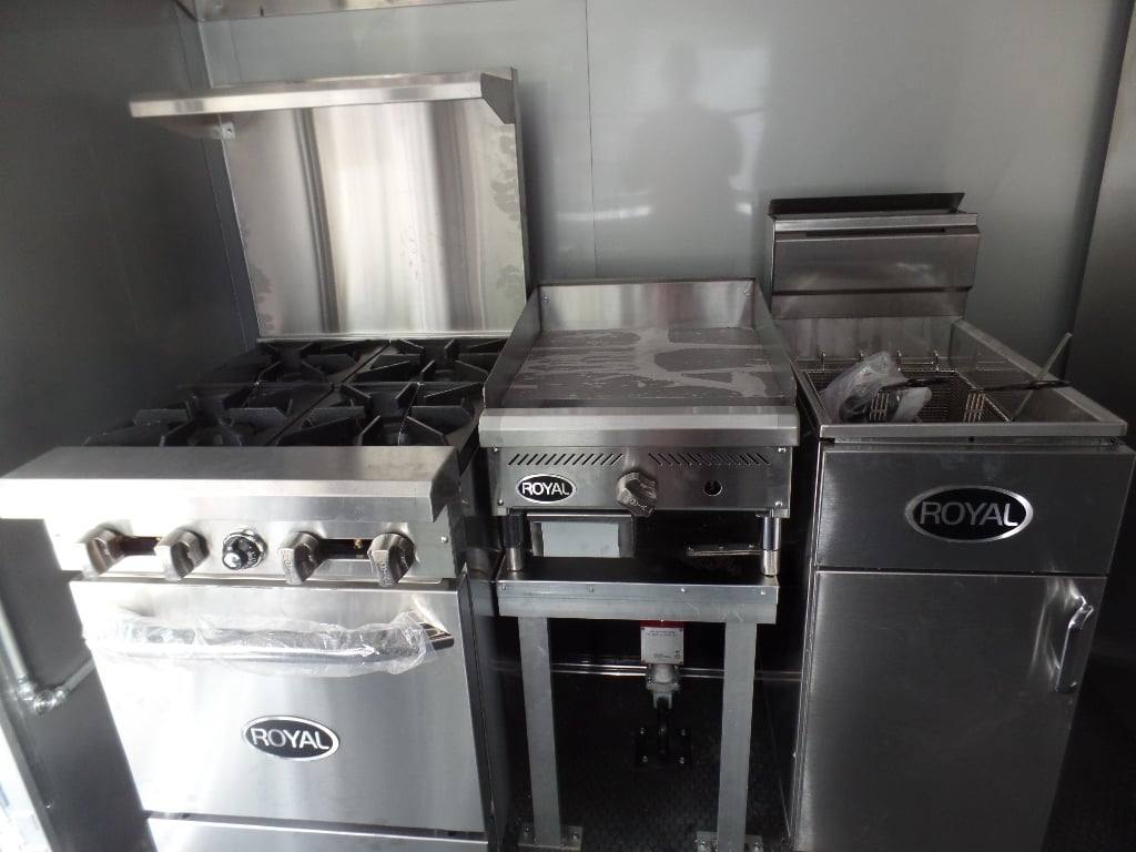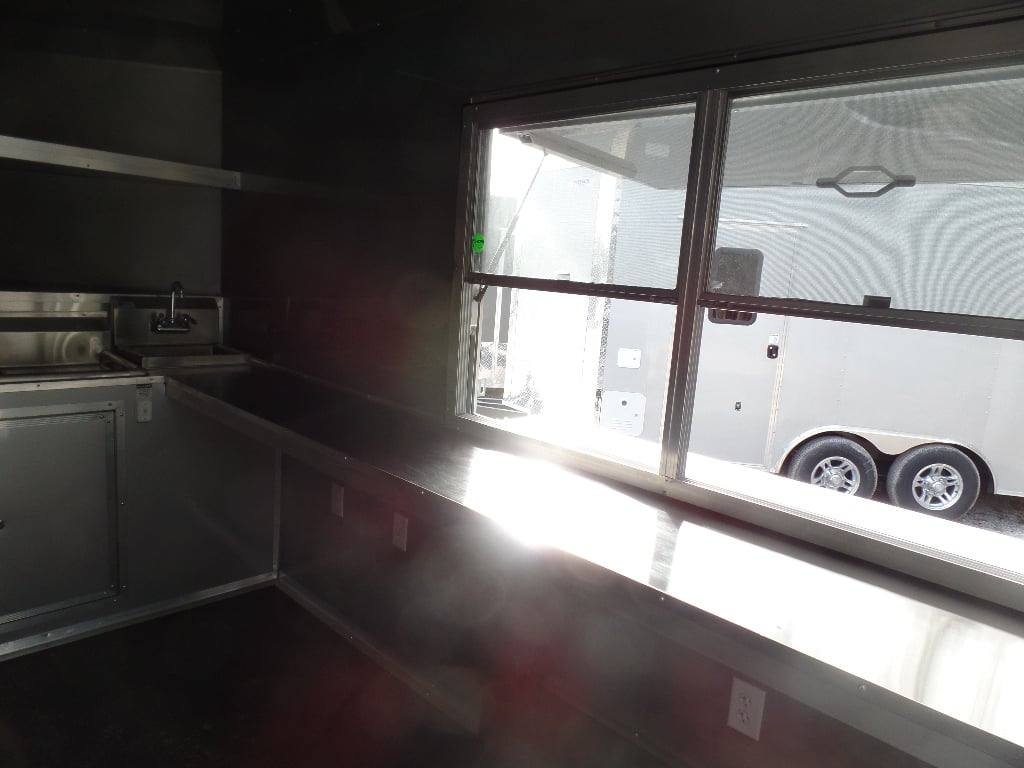 This trailer features all the appliances, gas lines, and fire suppression. It also has a 5 ft porch with standard railing and the rear is made to be removable, (2) 3500 lb axles with brakes, a 36 in x 6 ft commercial grease hood, and a 36 in generator box with slide out tray and drop leg.